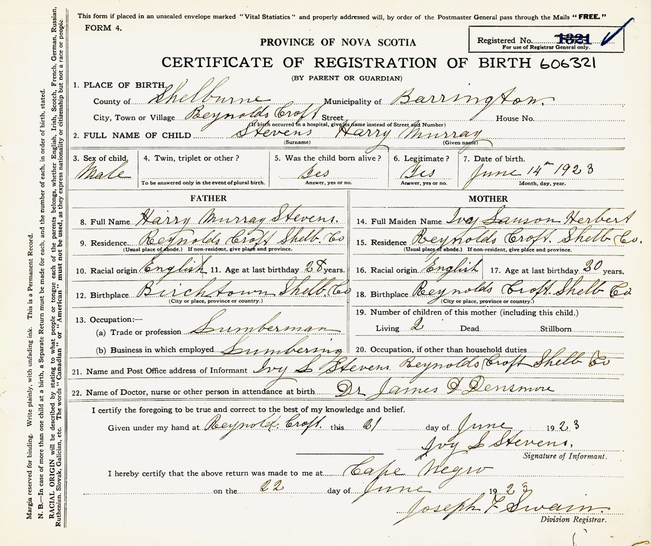 Male Birth Registration: Year: 1923 number: 60600321
