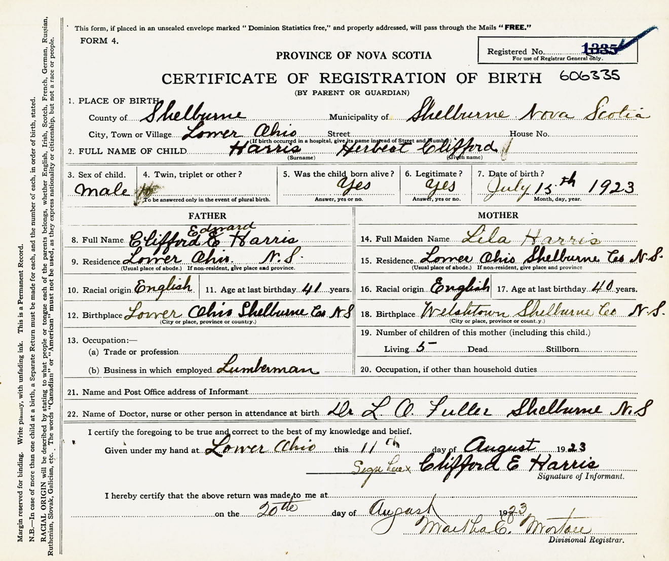 Male Birth Registration: Year: 1923 number: 60600335