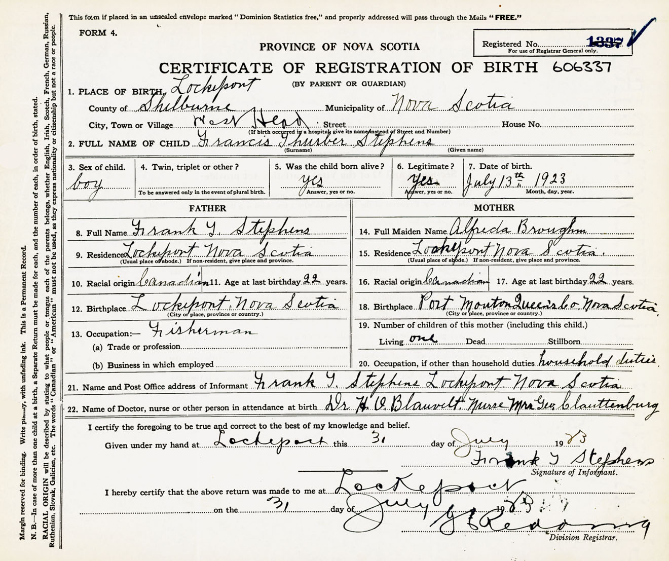 Male Birth Registration: Year: 1923 number: 60600337