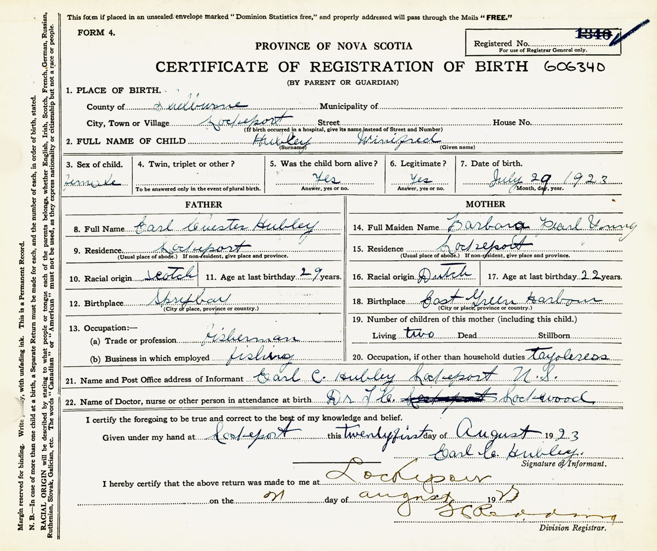 Female Birth Registration: Year: 1923 number: 60600340