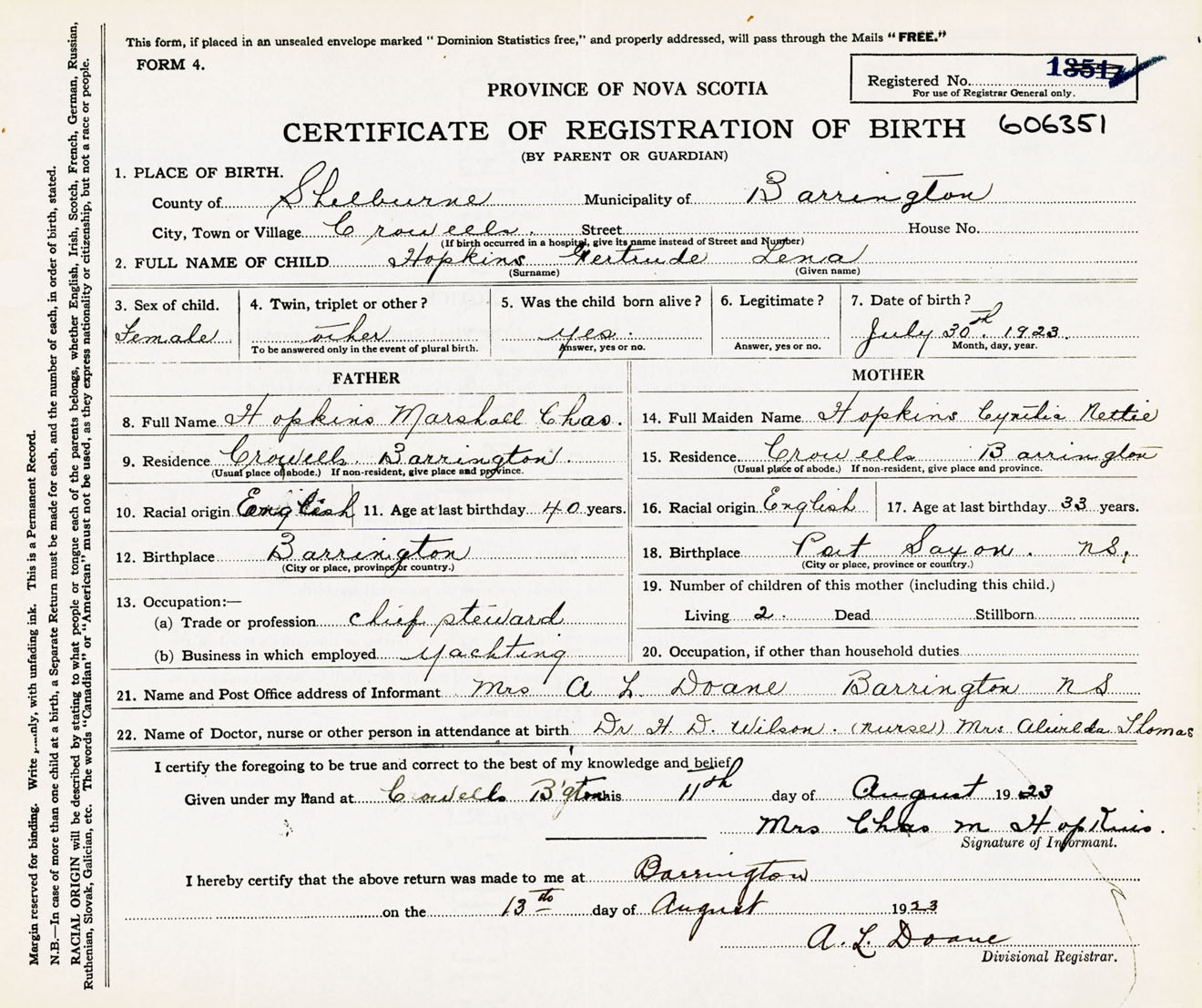 Female Birth Registration: Year: 1923 number: 60600351