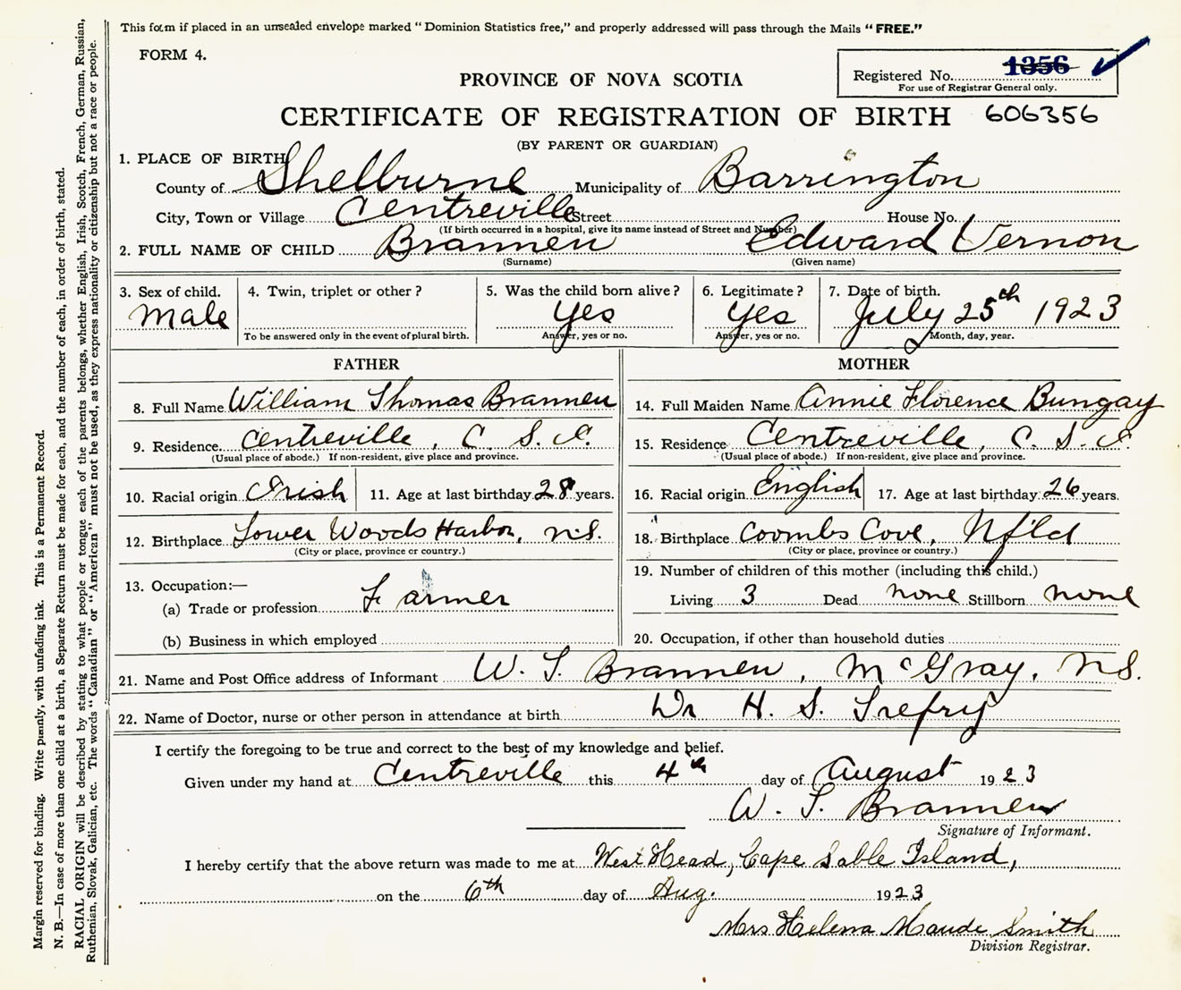 Male Birth Registration: Year: 1923 number: 60600356