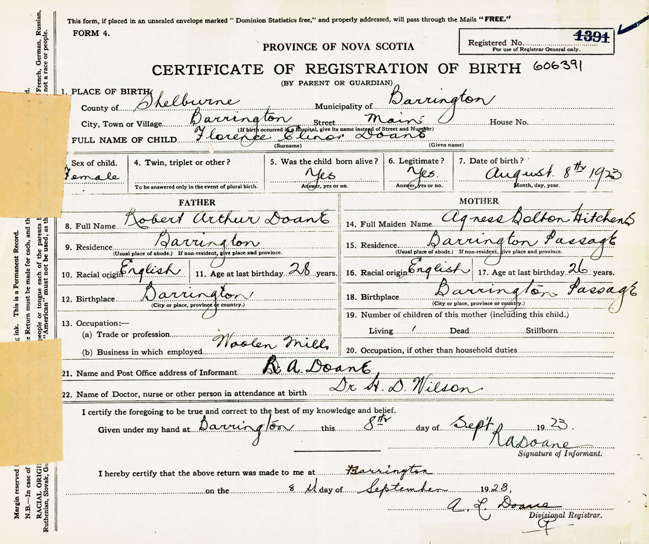 Female Birth Registration: Year: 1923 number: 60600391