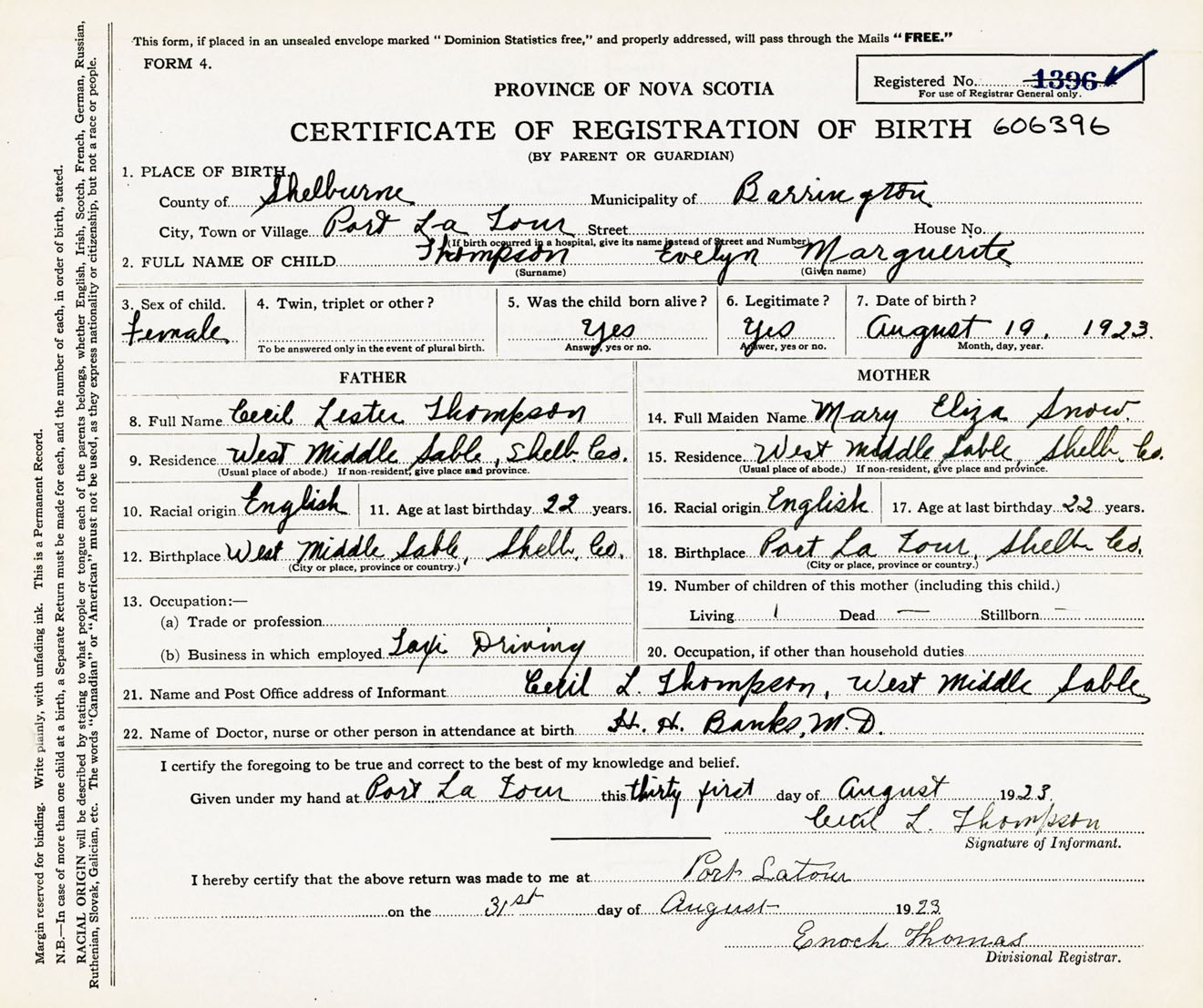 Female Birth Registration: Year: 1923 number: 60600396