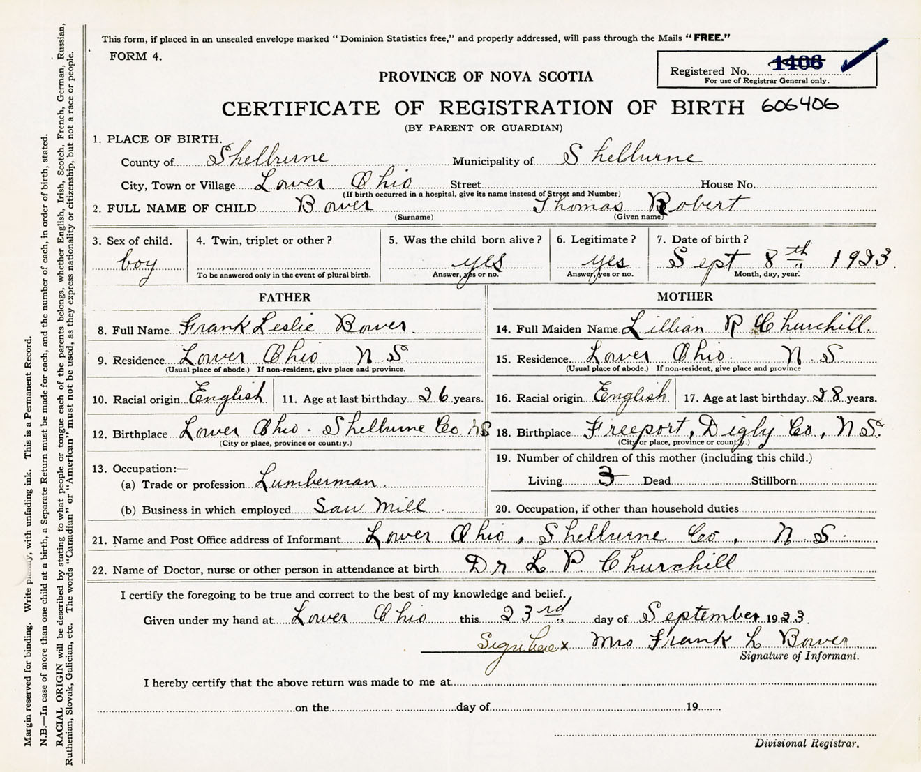 Male Birth Registration: Year: 1923 number: 60600406