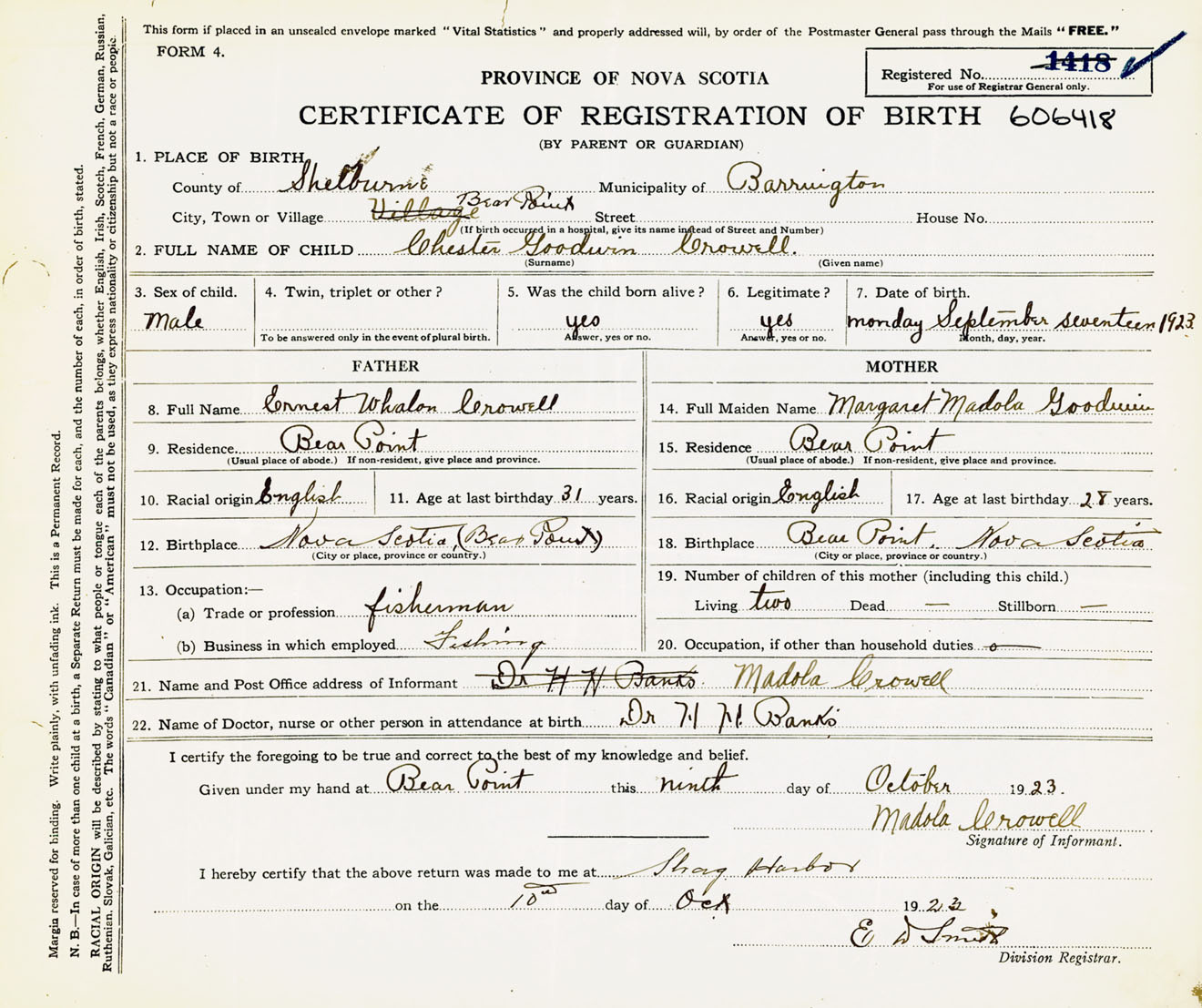 Male Birth Registration: Year: 1923 number: 60600418