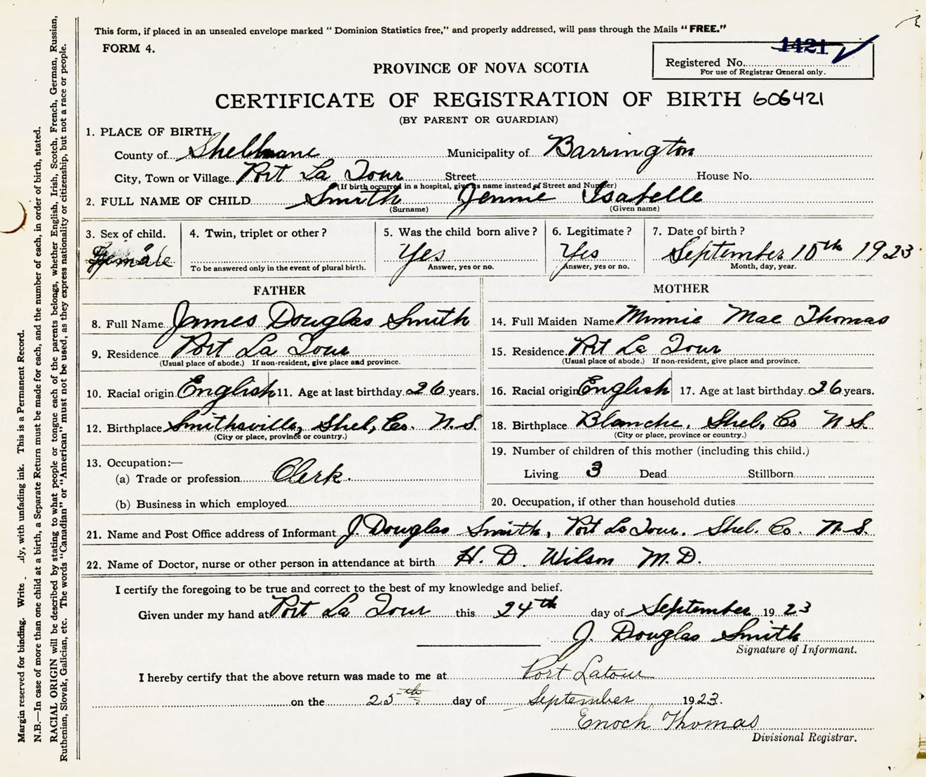 Female Birth Registration: Year: 1923 number: 60600421
