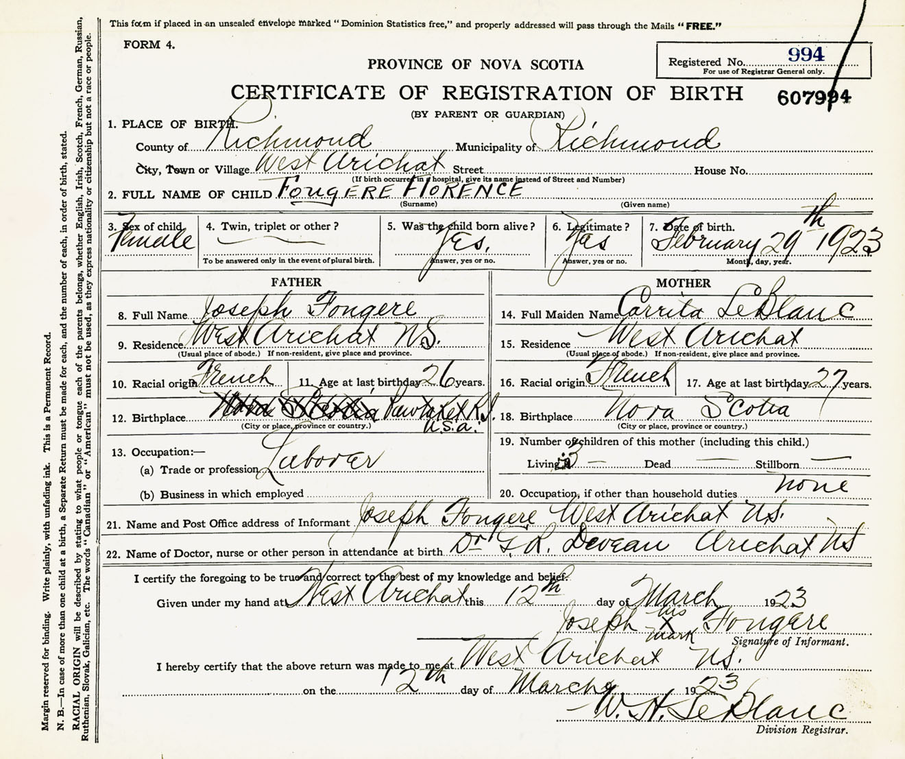 Female Birth Registration: Year: 1923 number: 60700994