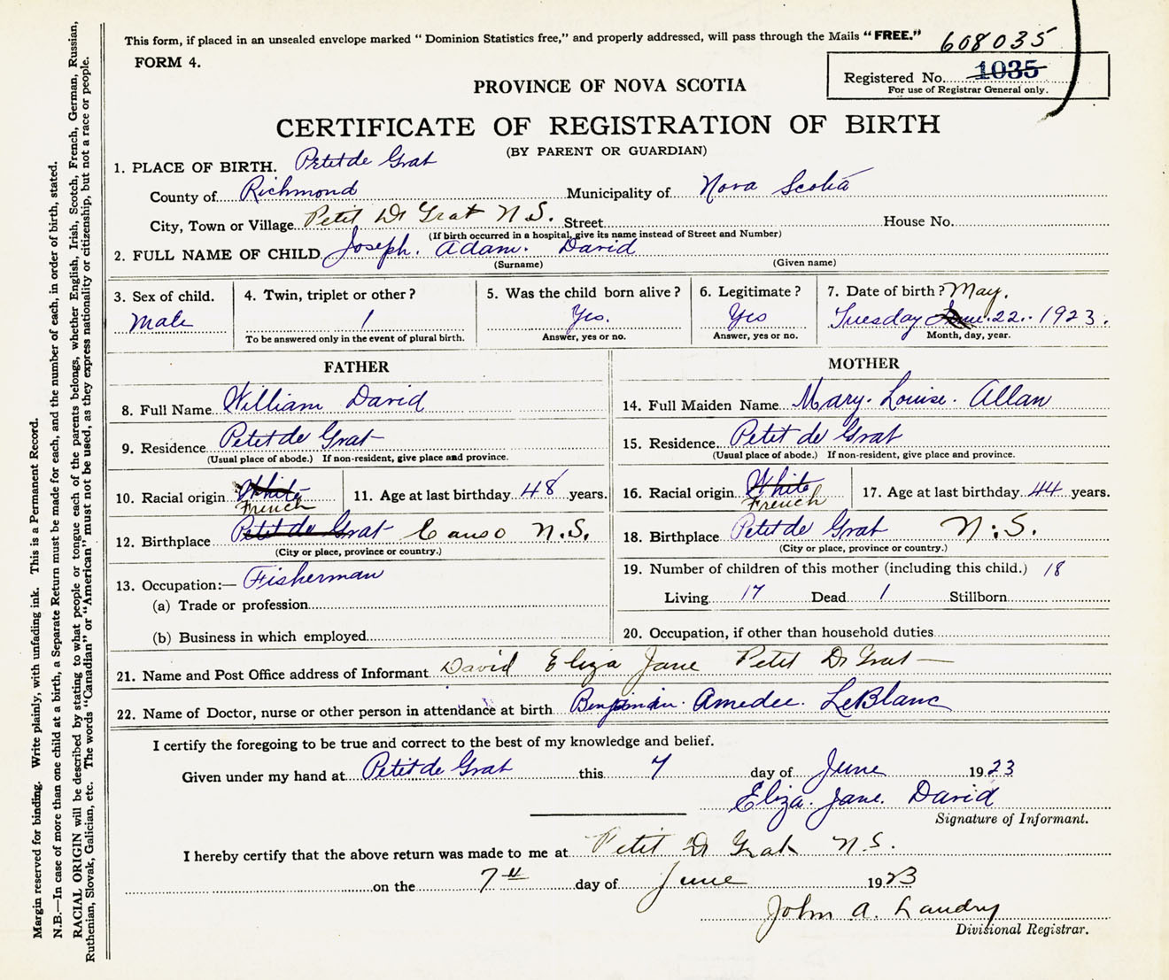 Male Birth Registration: Year: 1923 number: 60800035