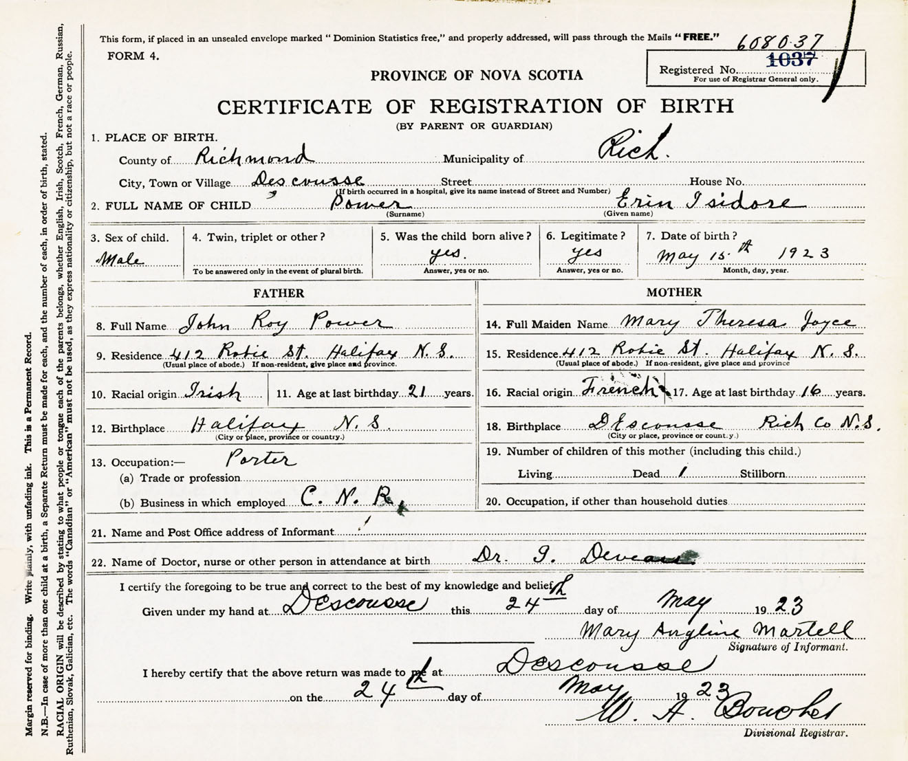 Male Birth Registration: Year: 1923 number: 60800037