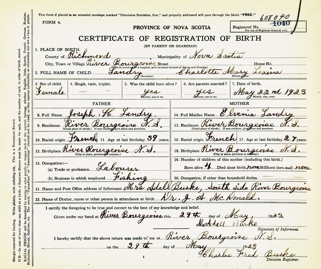Female Birth Registration: Year: 1923 number: 60800040