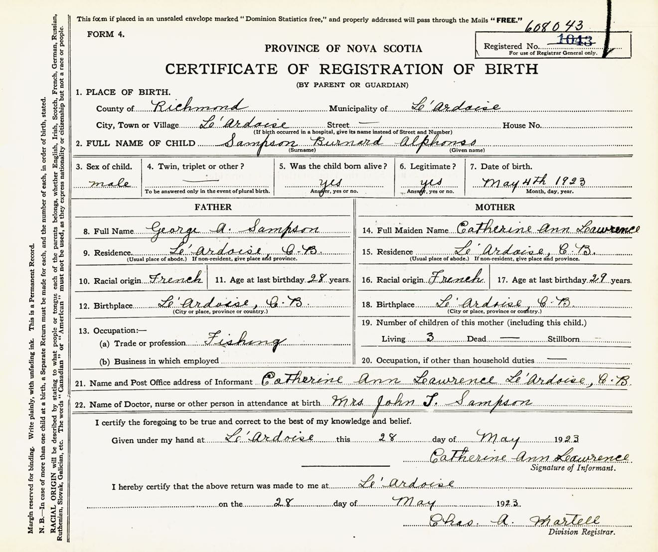 Male Birth Registration: Year: 1923 number: 60800043