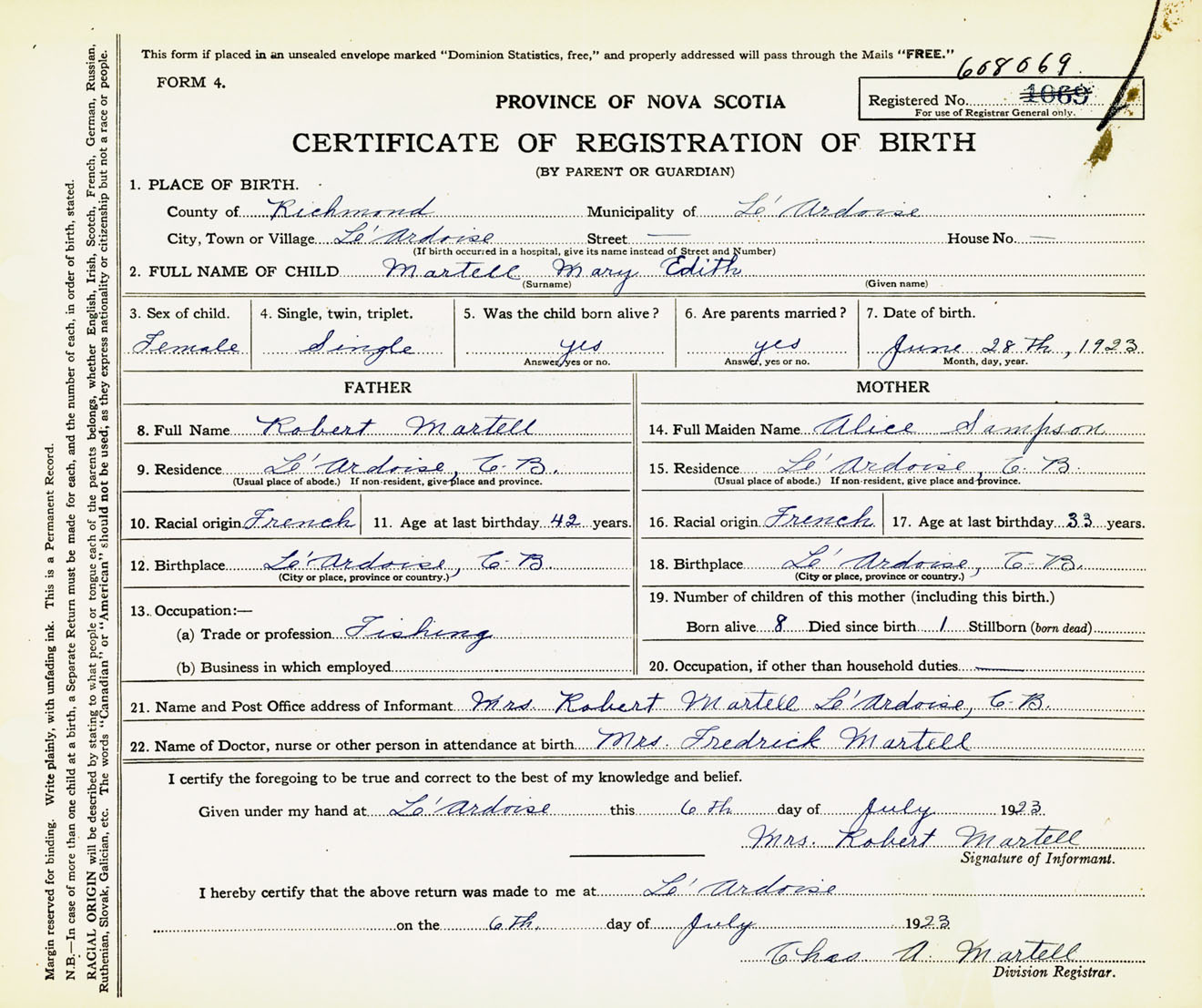Female Birth Registration: Year: 1923 number: 60800069