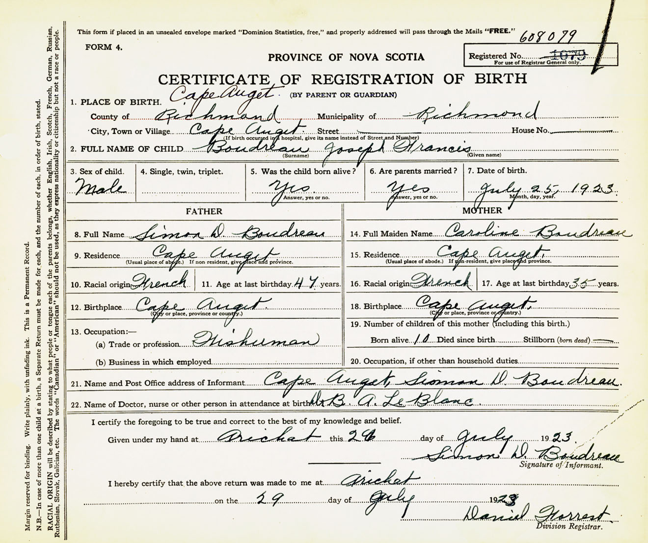 Male Birth Registration: Year: 1923 number: 60800079