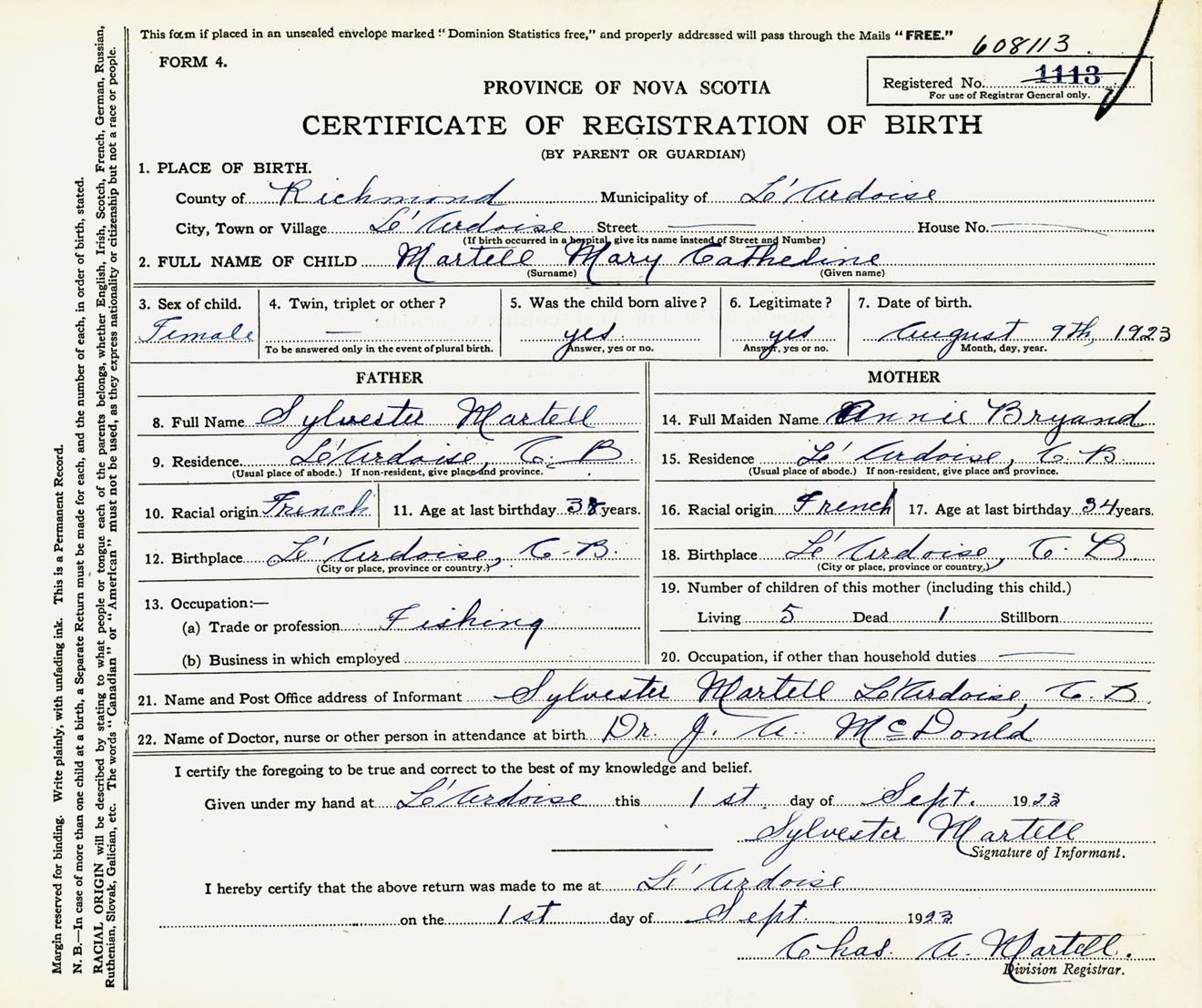 Female Birth Registration: Year: 1923 number: 60800113