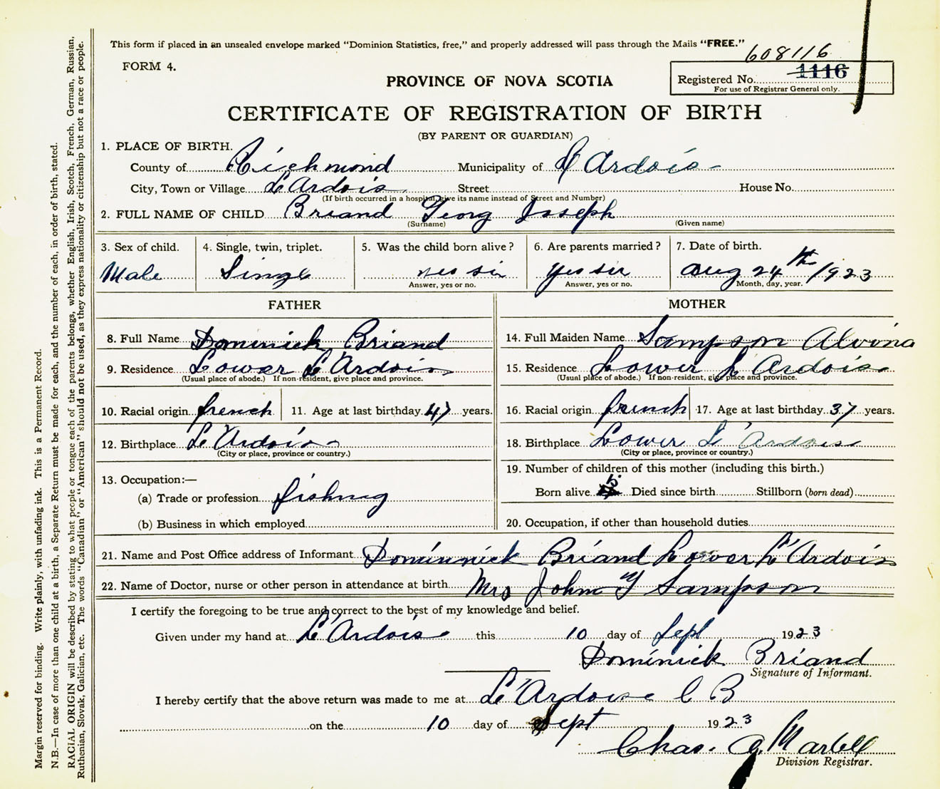 Male Birth Registration: Year: 1923 number: 60800116