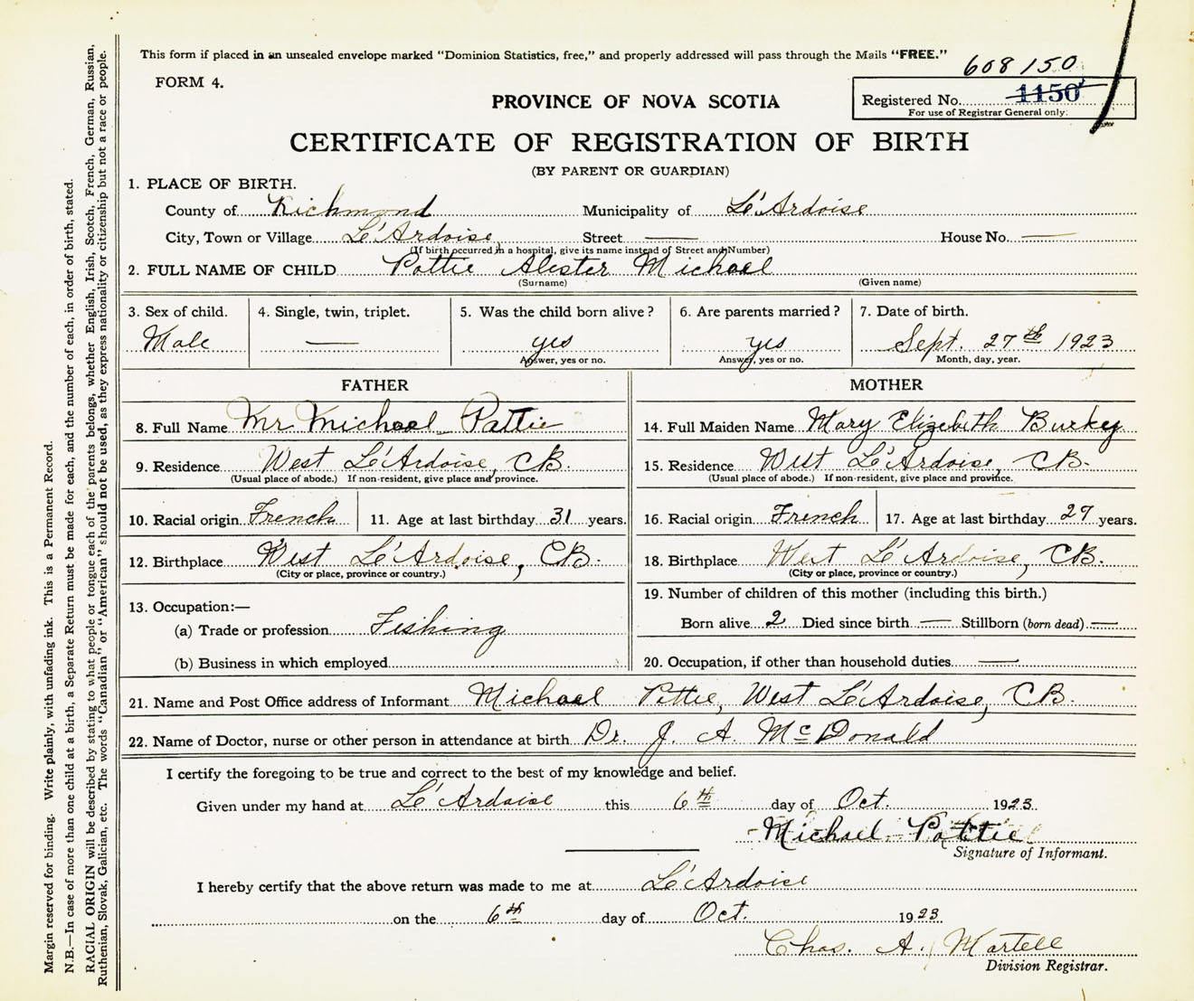 Male Birth Registration: Year: 1923 number: 60800150