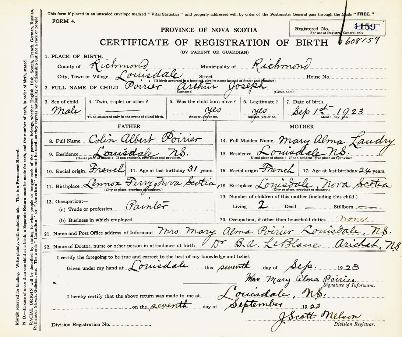 Male Birth Registration: Year: 1923 number: 60800159