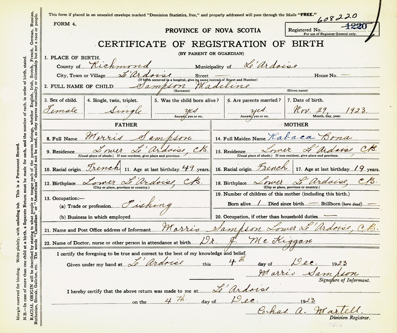 Female Birth Registration: Year: 1923 number: 60800220