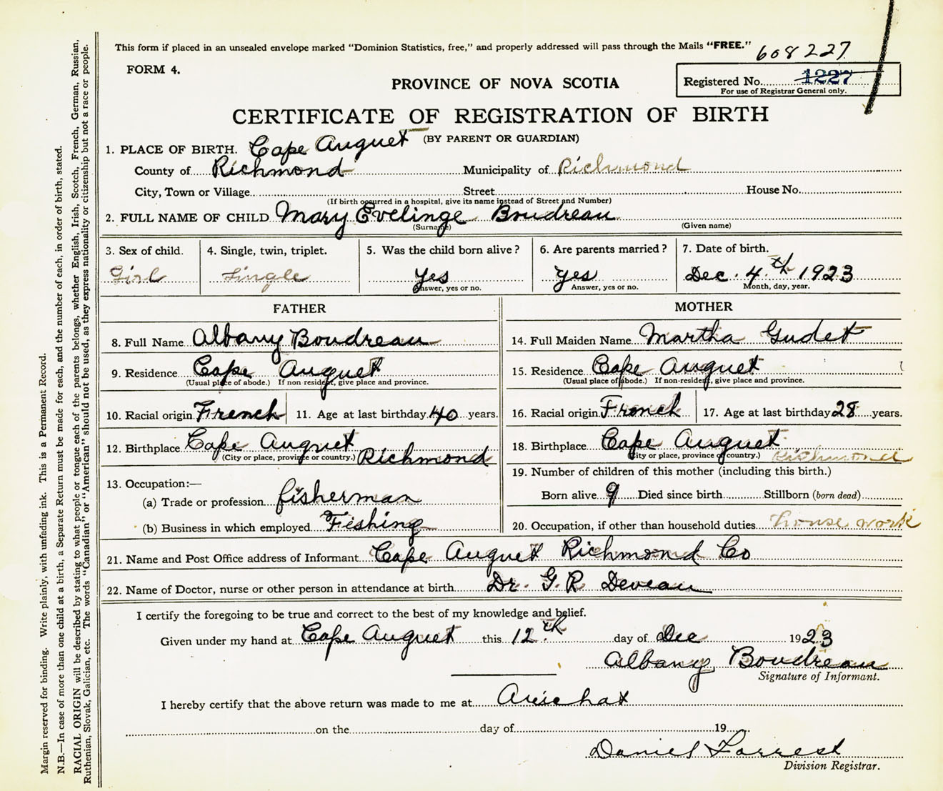 Female Birth Registration: Year: 1923 number: 60800227