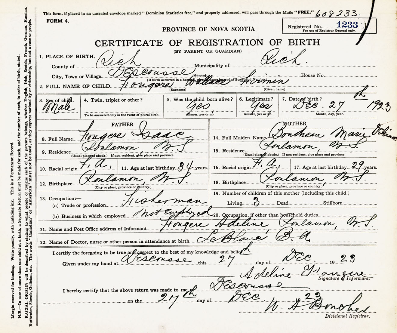 Male Birth Registration: Year: 1923 number: 60800233
