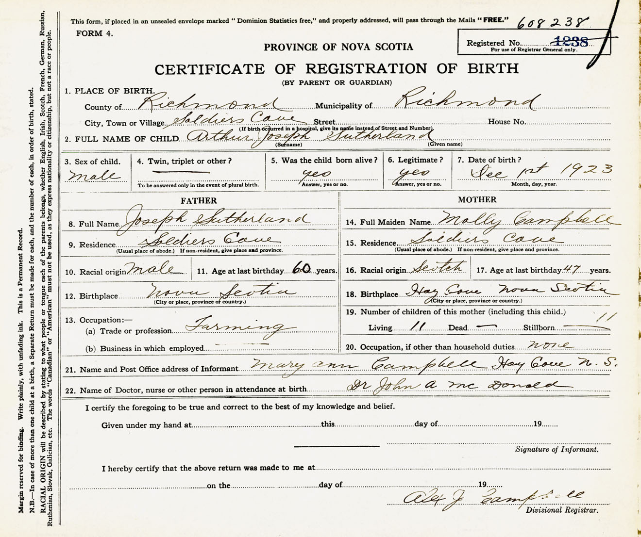 Male Birth Registration: Year: 1923 number: 60800238