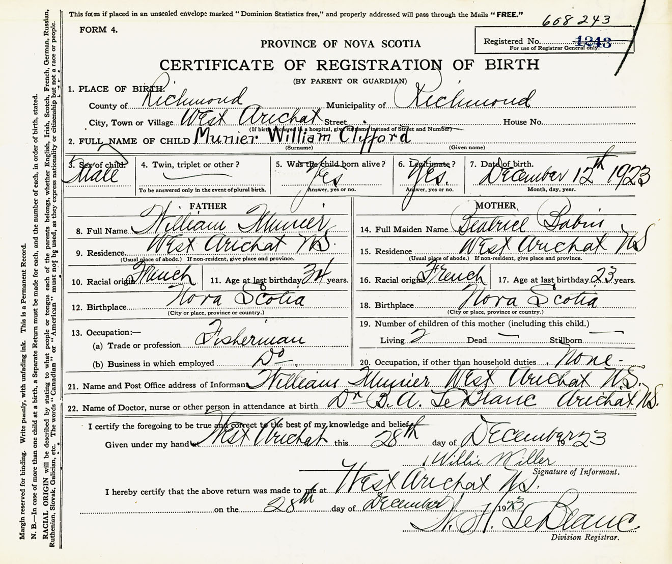 Male Birth Registration: Year: 1923 number: 60800243
