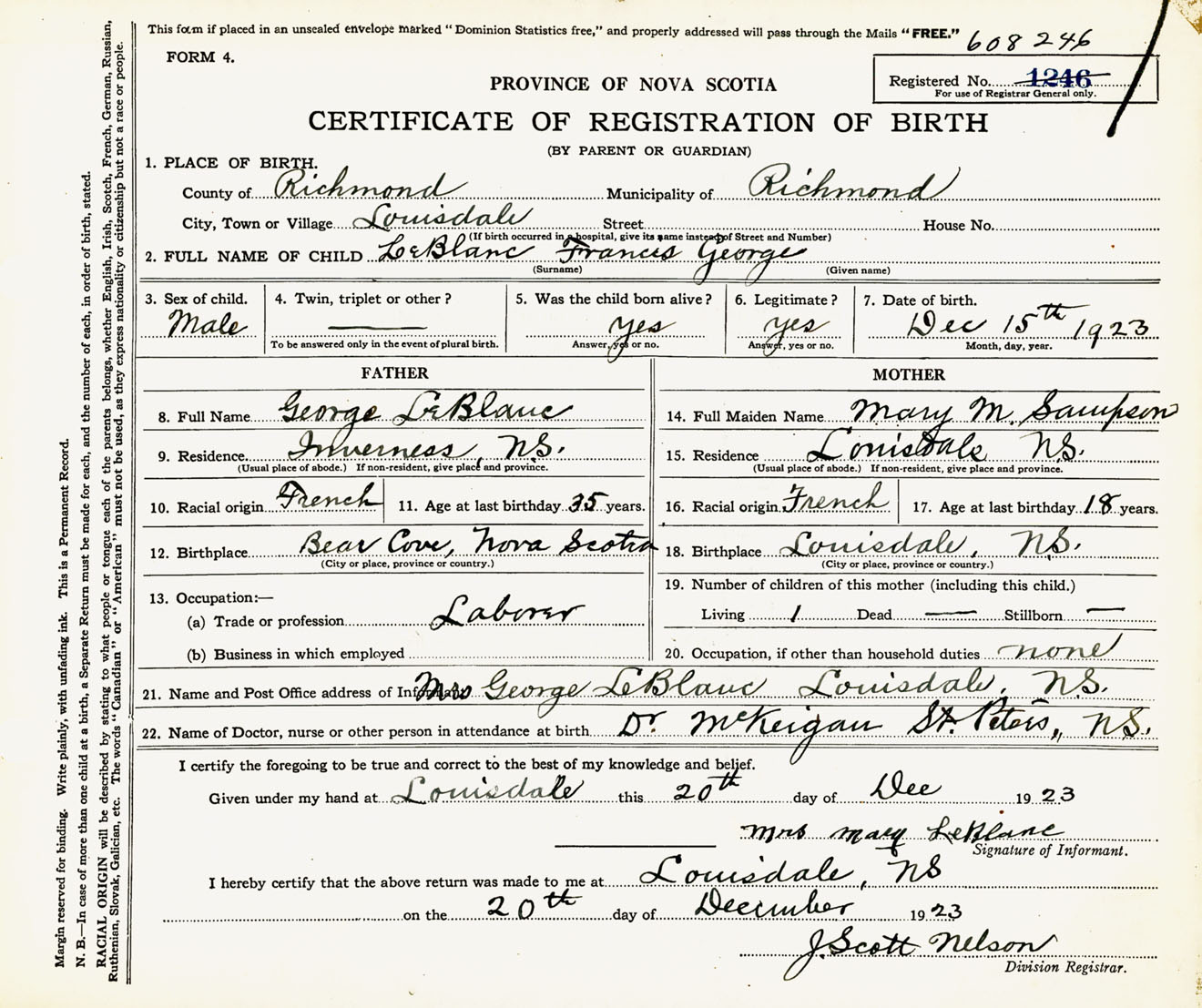 Male Birth Registration: Year: 1923 number: 60800246