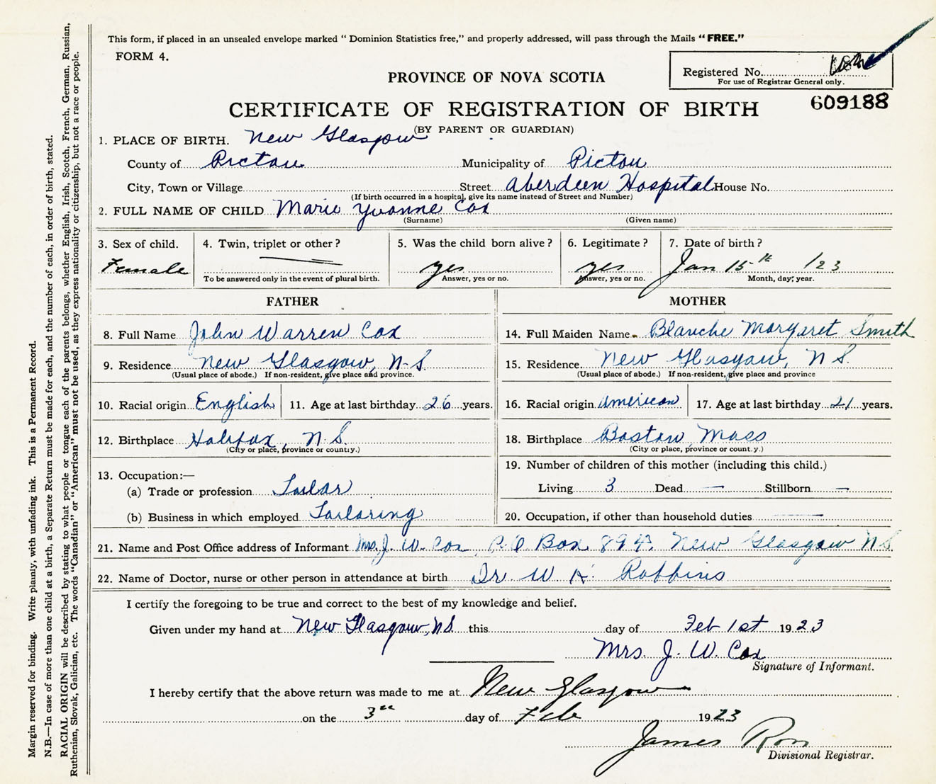 Female Birth Registration: Year: 1923 number: 60900188