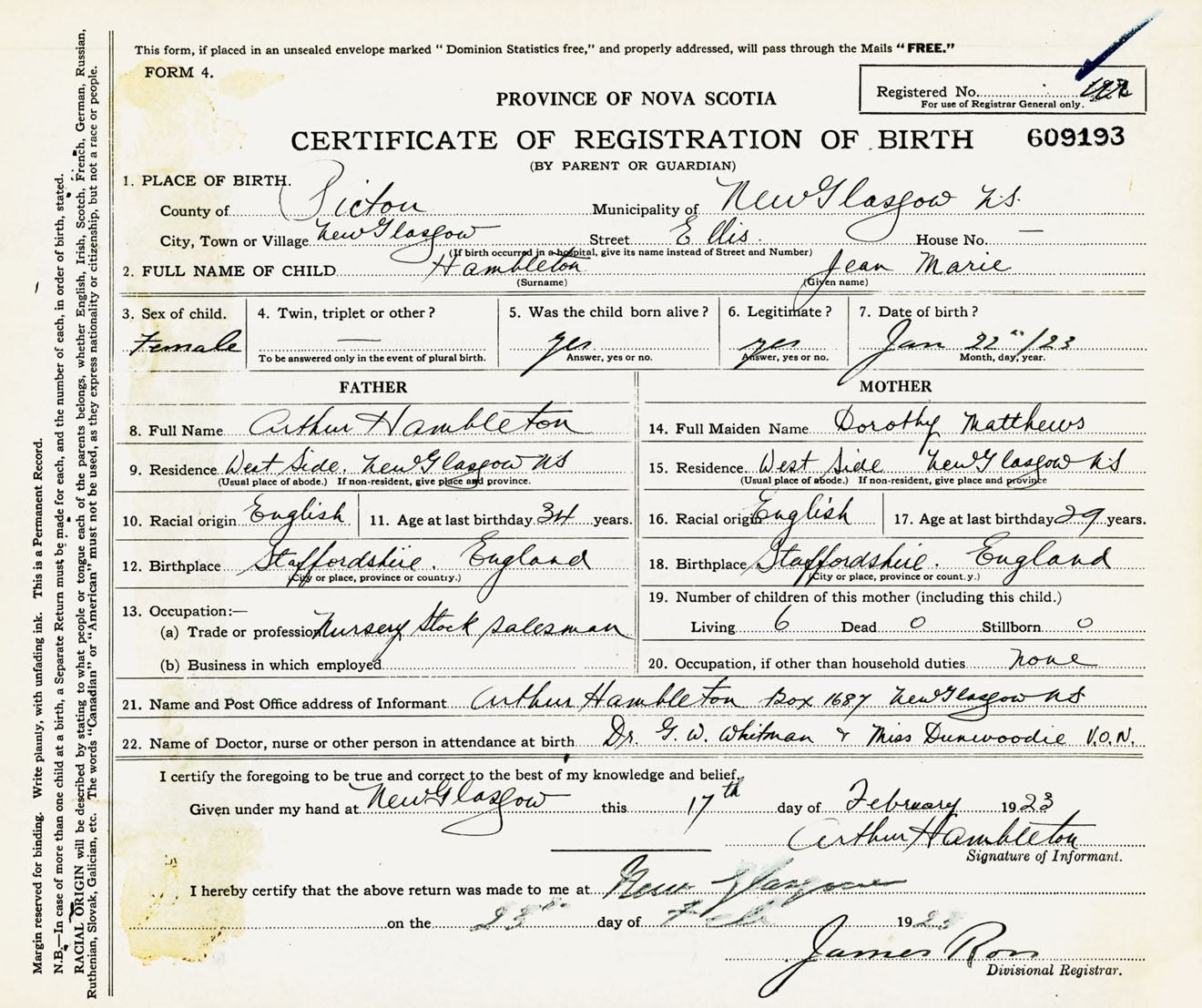 Female Birth Registration: Year: 1923 number: 60900193