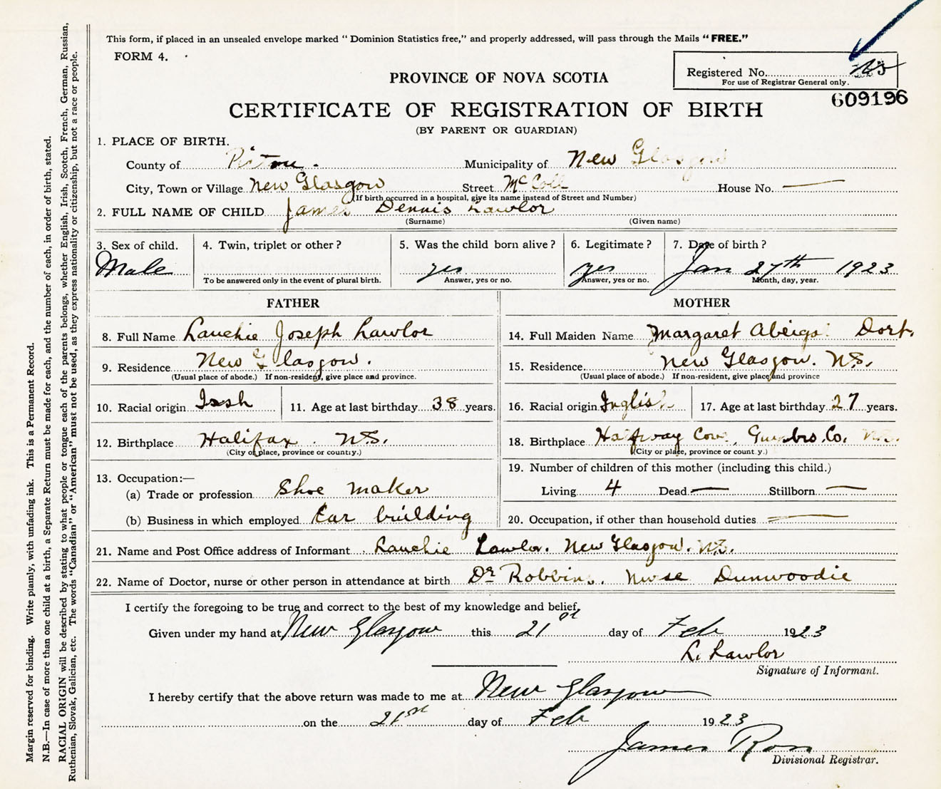 Male Birth Registration: Year: 1923 number: 60900196