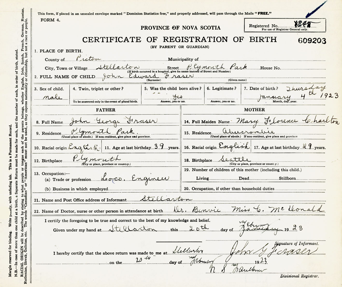 Male Birth Registration: Year: 1923 number: 60900203
