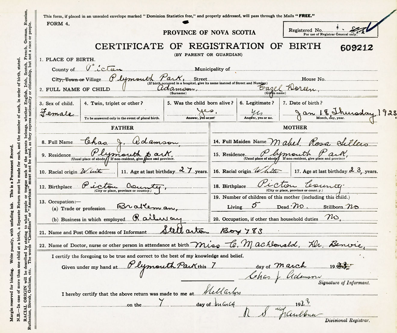 Female Birth Registration: Year: 1923 number: 60900212