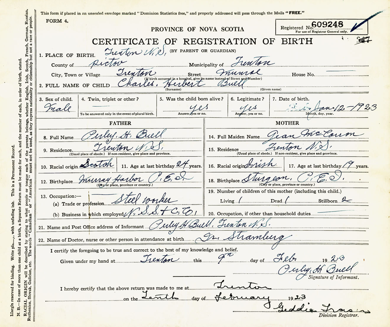Male Birth Registration: Year: 1923 number: 60900248
