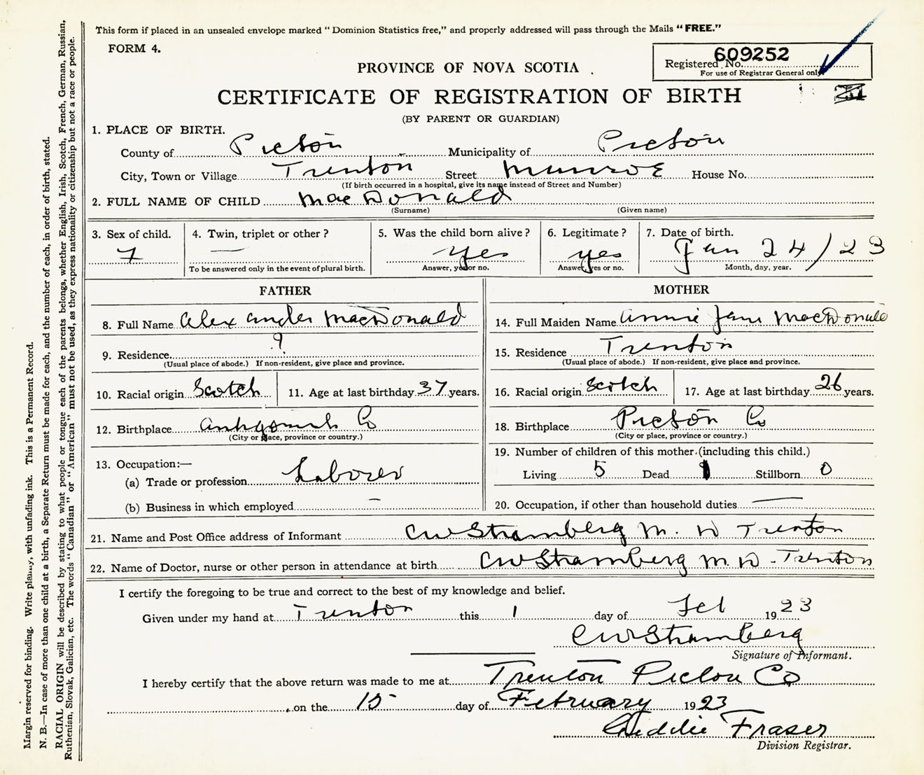 Female Birth Registration: Year: 1923 number: 60900252