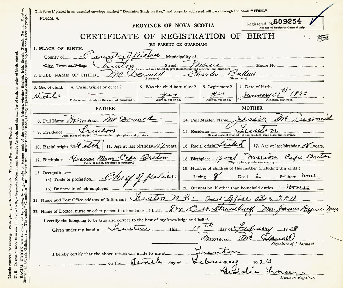 Male Birth Registration: Year: 1923 number: 60900254