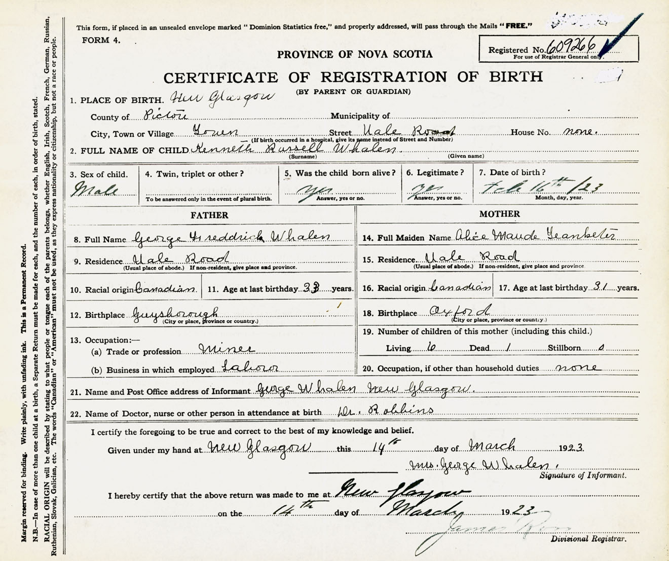 Male Birth Registration: Year: 1923 number: 60900266