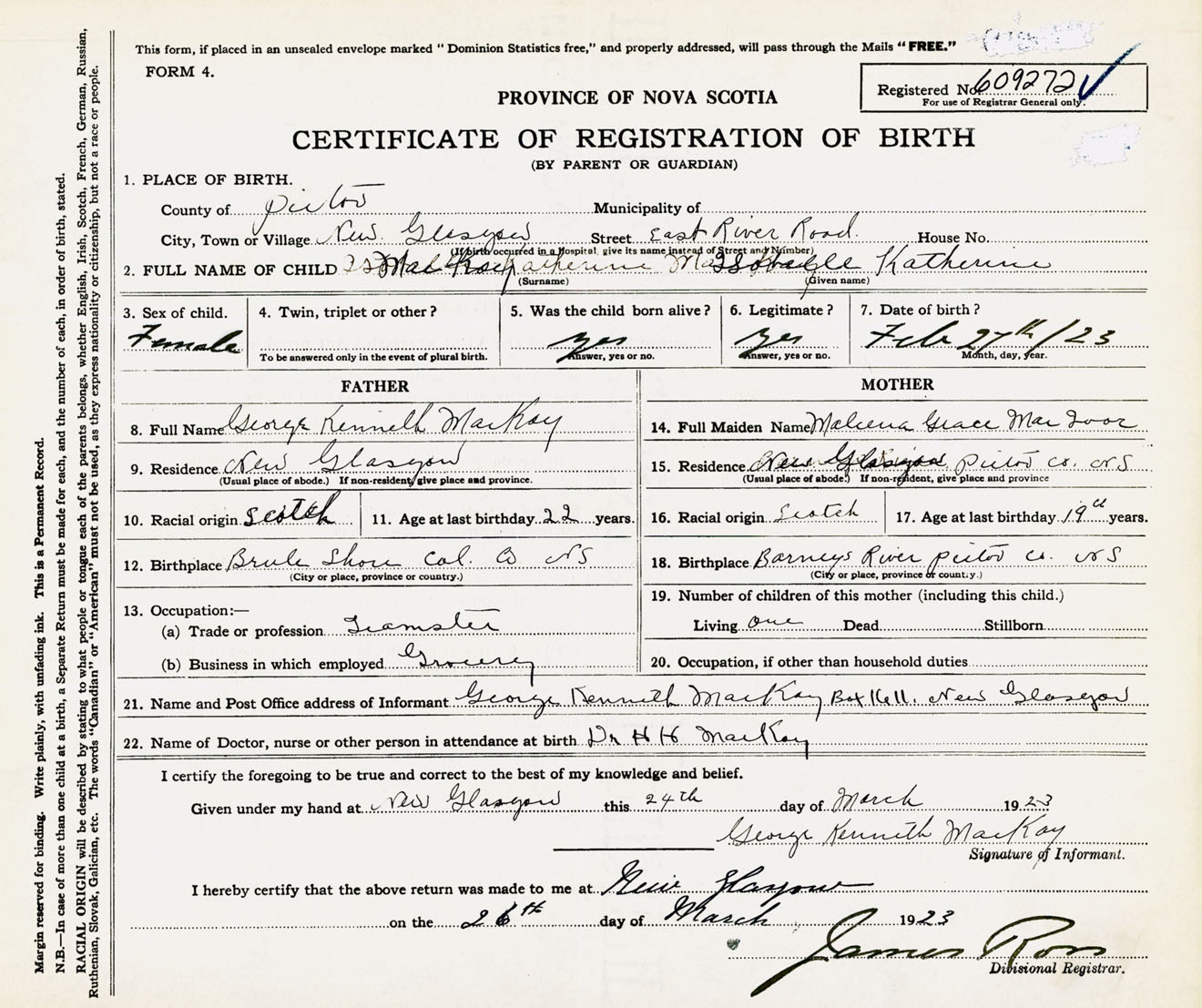 Female Birth Registration: Year: 1923 number: 60900272