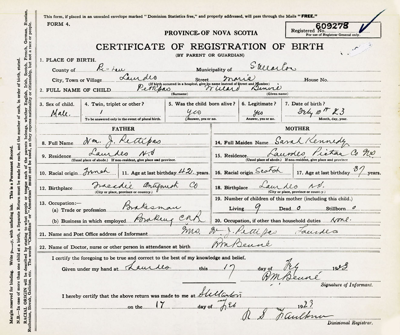 Male Birth Registration: Year: 1923 number: 60900278