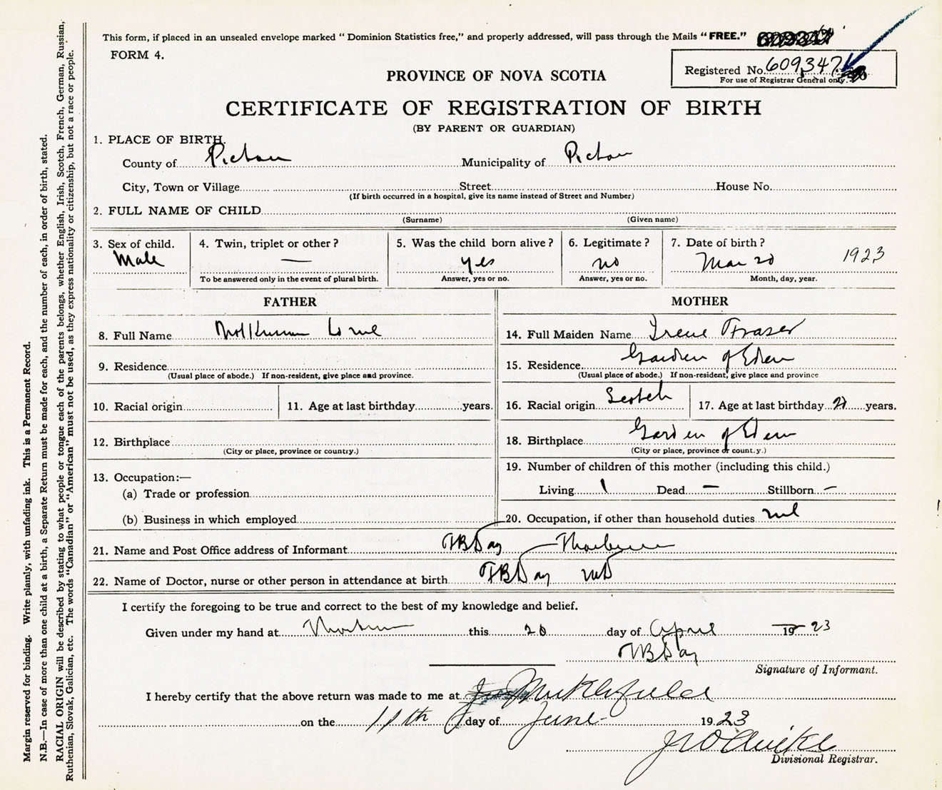 Male Birth Registration: Year: 1923 number: 60900347