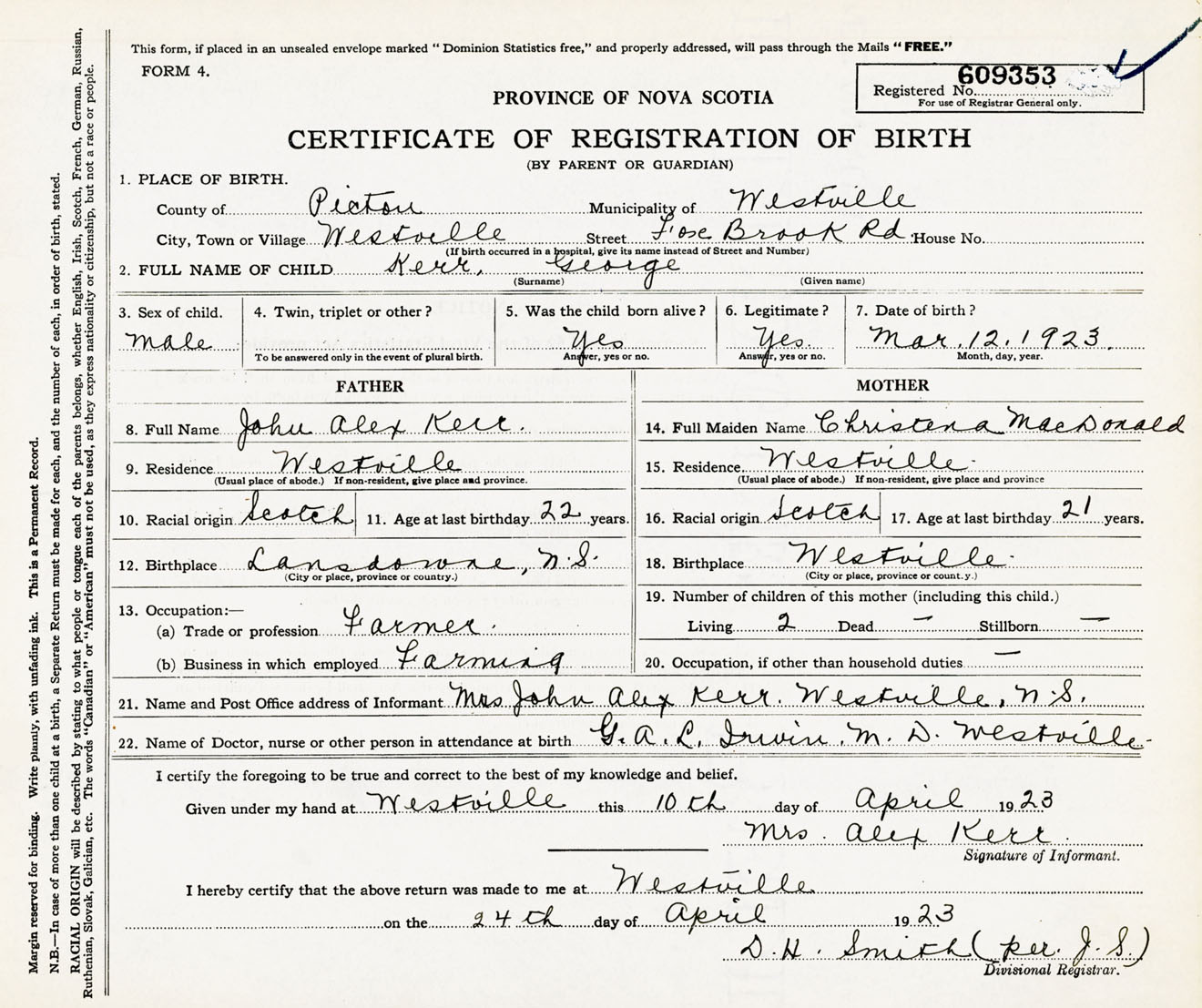 Male Birth Registration: Year: 1923 number: 60900353