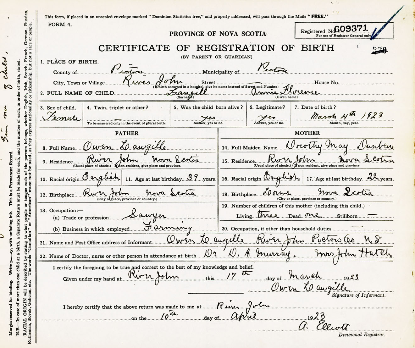 Female Birth Registration: Year: 1923 number: 60900371