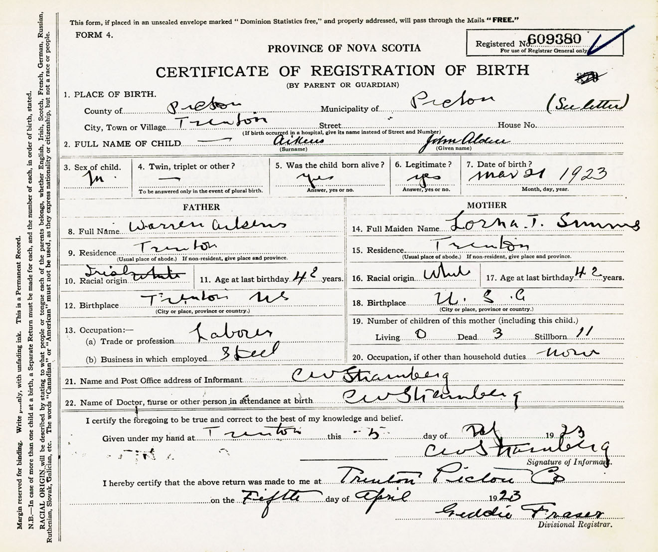 Male Birth Registration: Year: 1923 number: 60900380