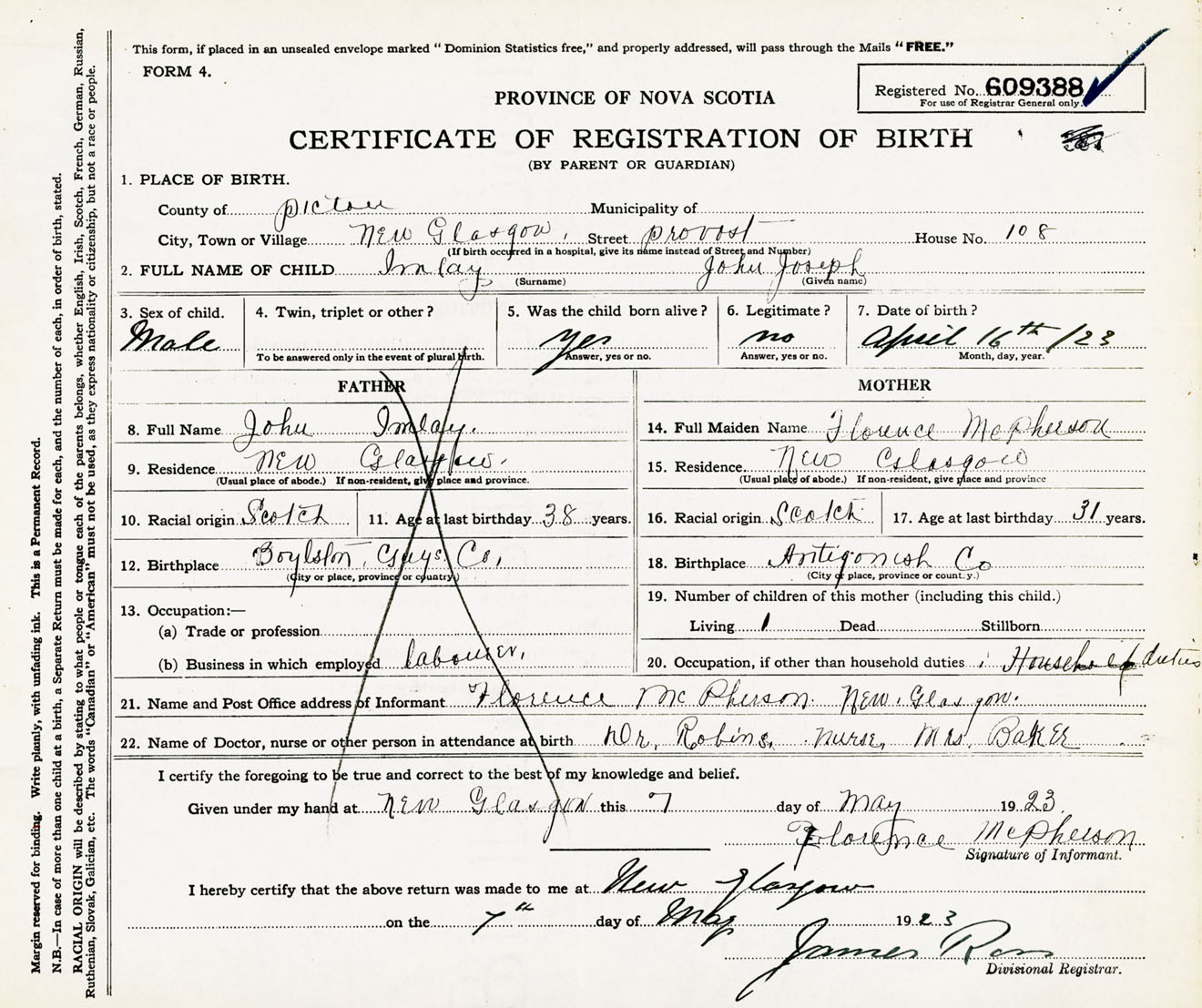 Male Birth Registration: Year: 1923 number: 60900388