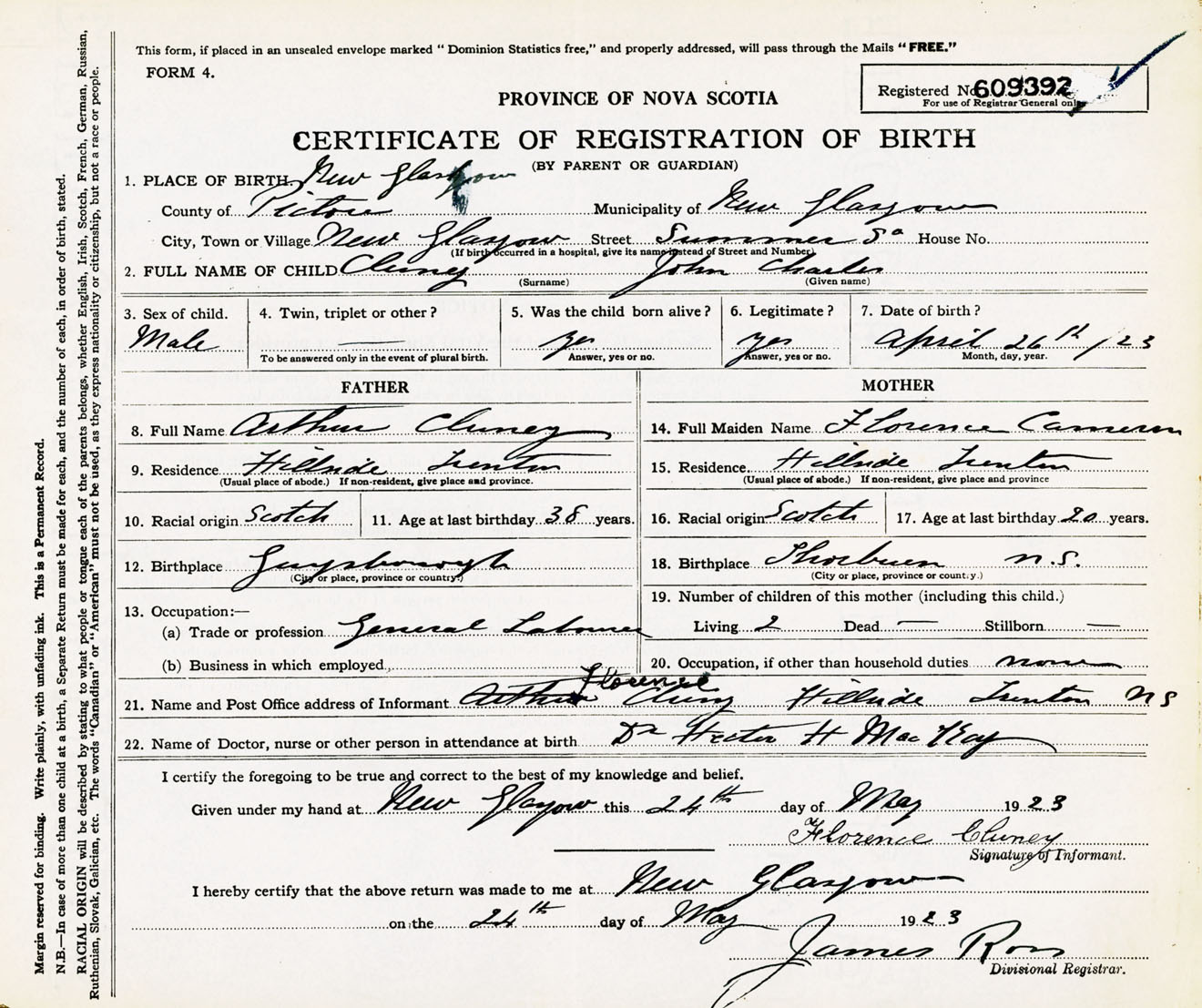 Male Birth Registration: Year: 1923 number: 60900392