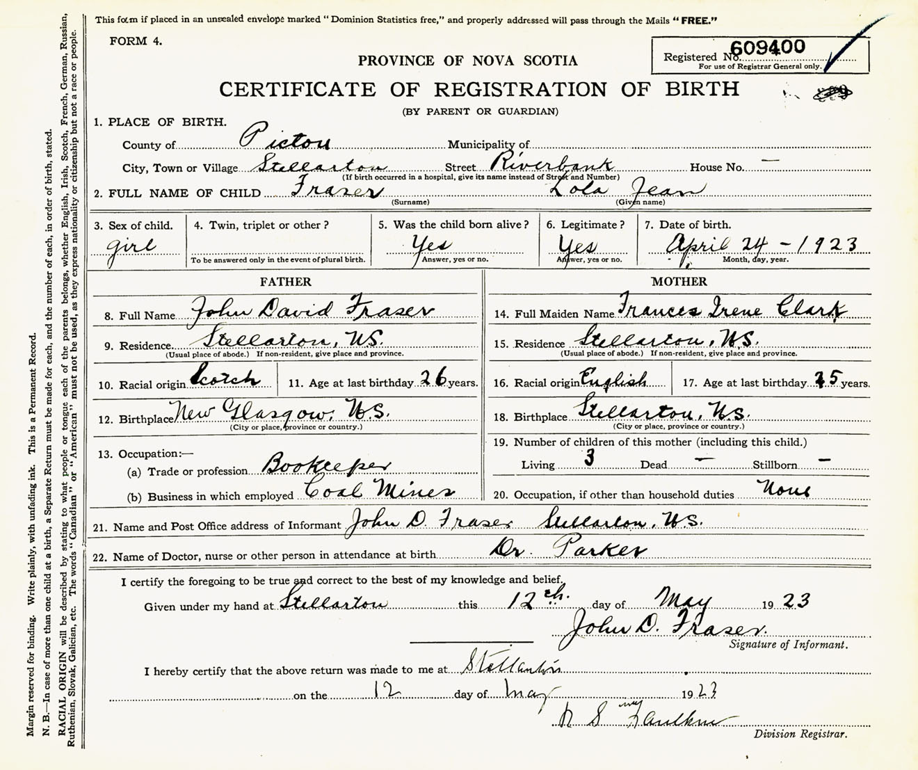 Female Birth Registration: Year: 1923 number: 60900400