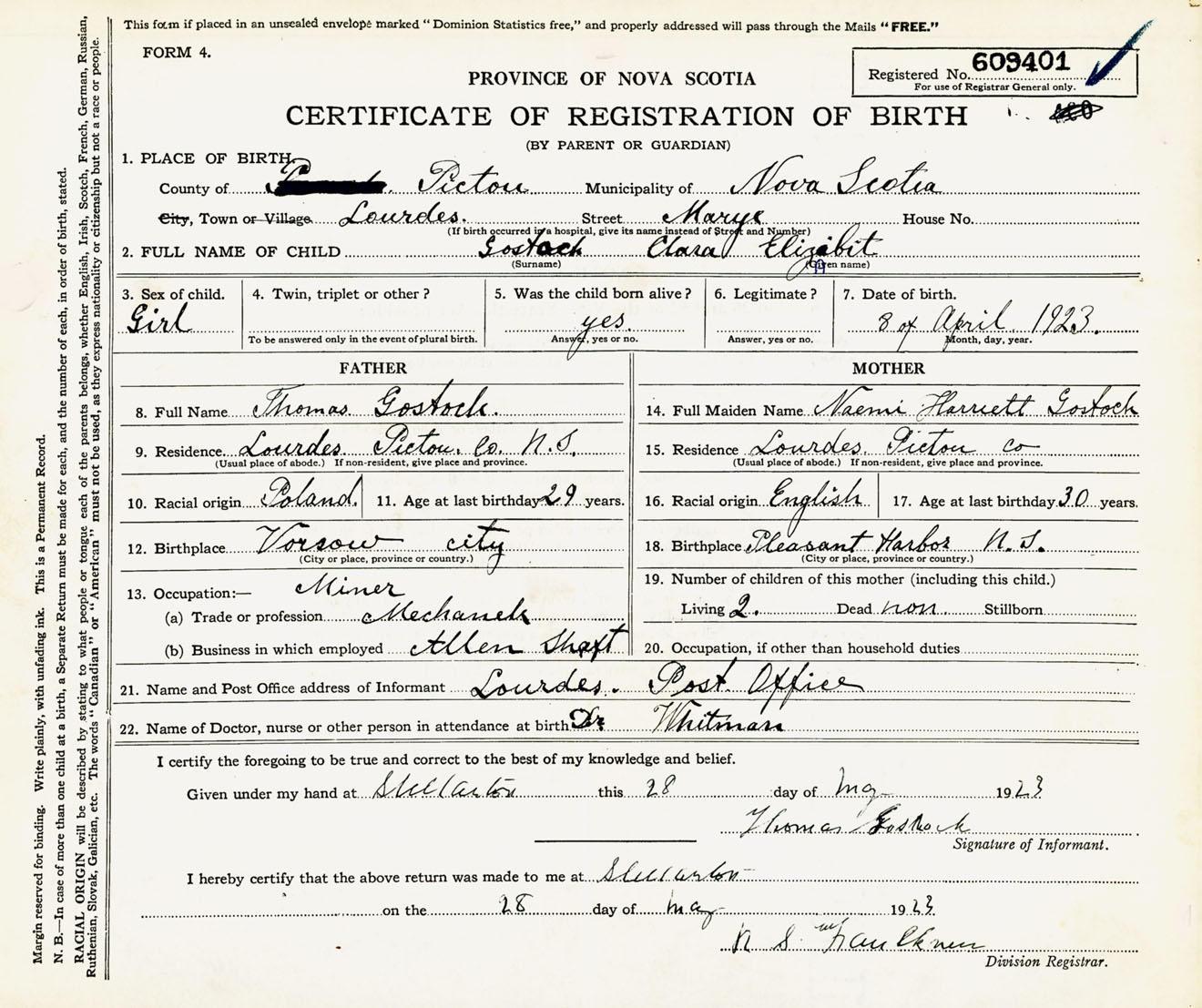 Female Birth Registration: Year: 1923 number: 60900401
