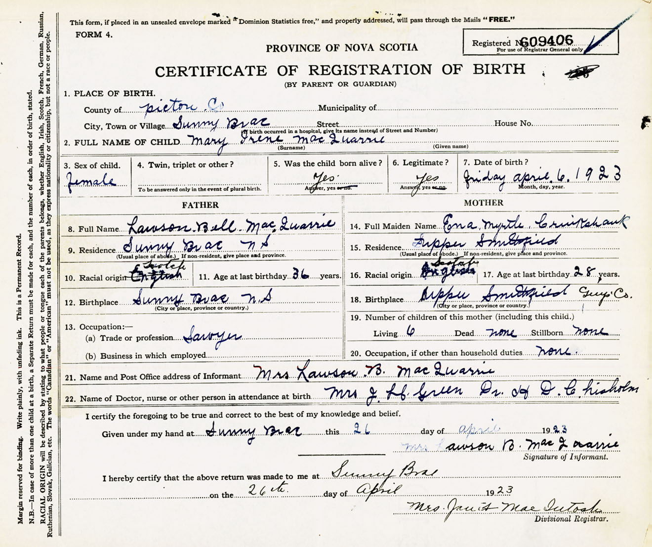 Female Birth Registration: Year: 1923 number: 60900406