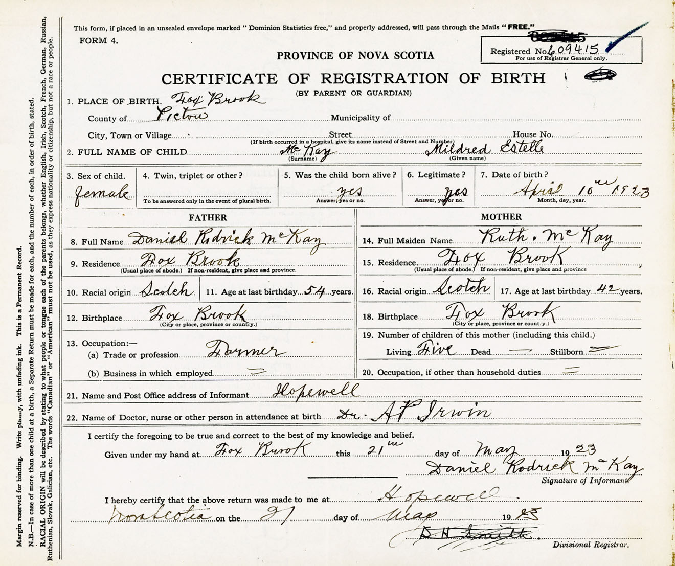 Female Birth Registration: Year: 1923 number: 60900415