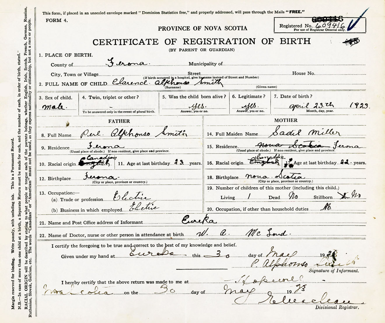 Male Birth Registration: Year: 1923 number: 60900416